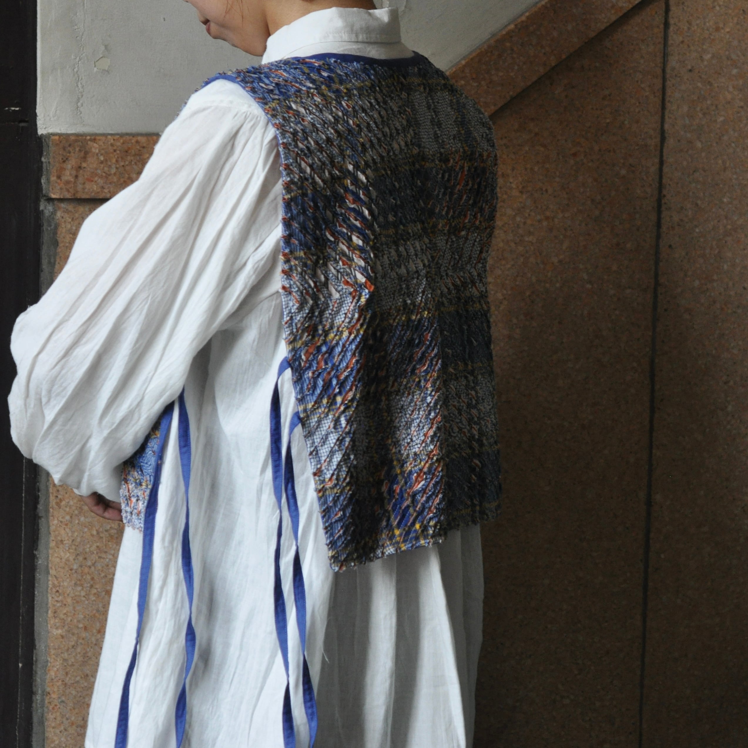 数枚重なる生地を菱形に割いた生地からなるベスト。