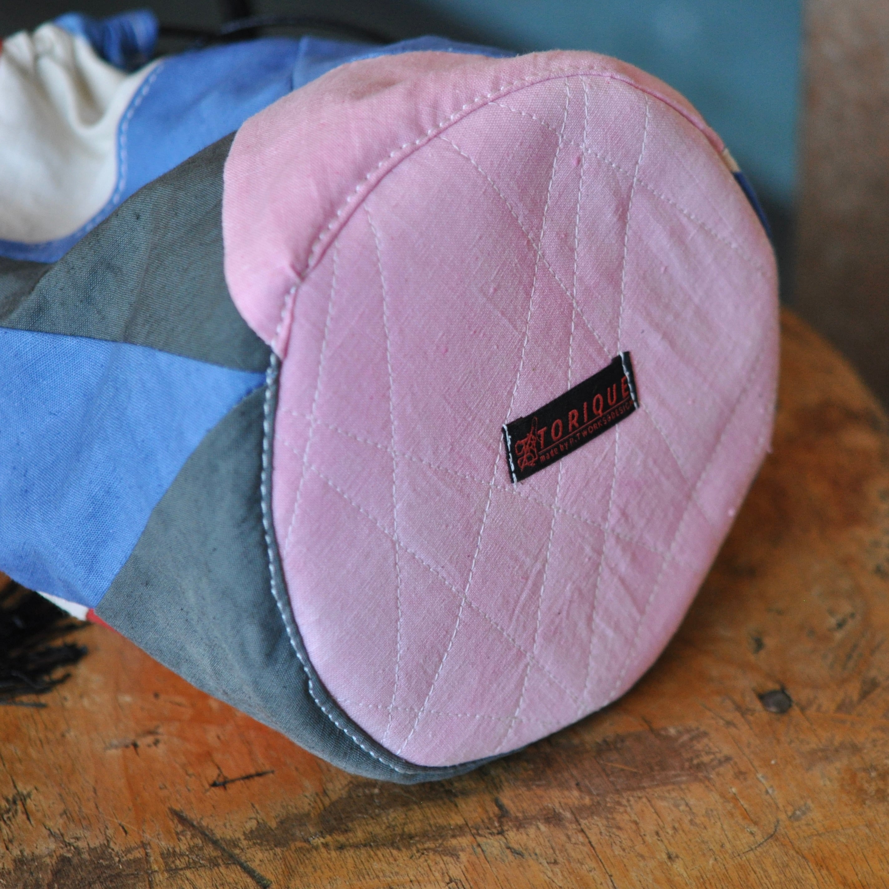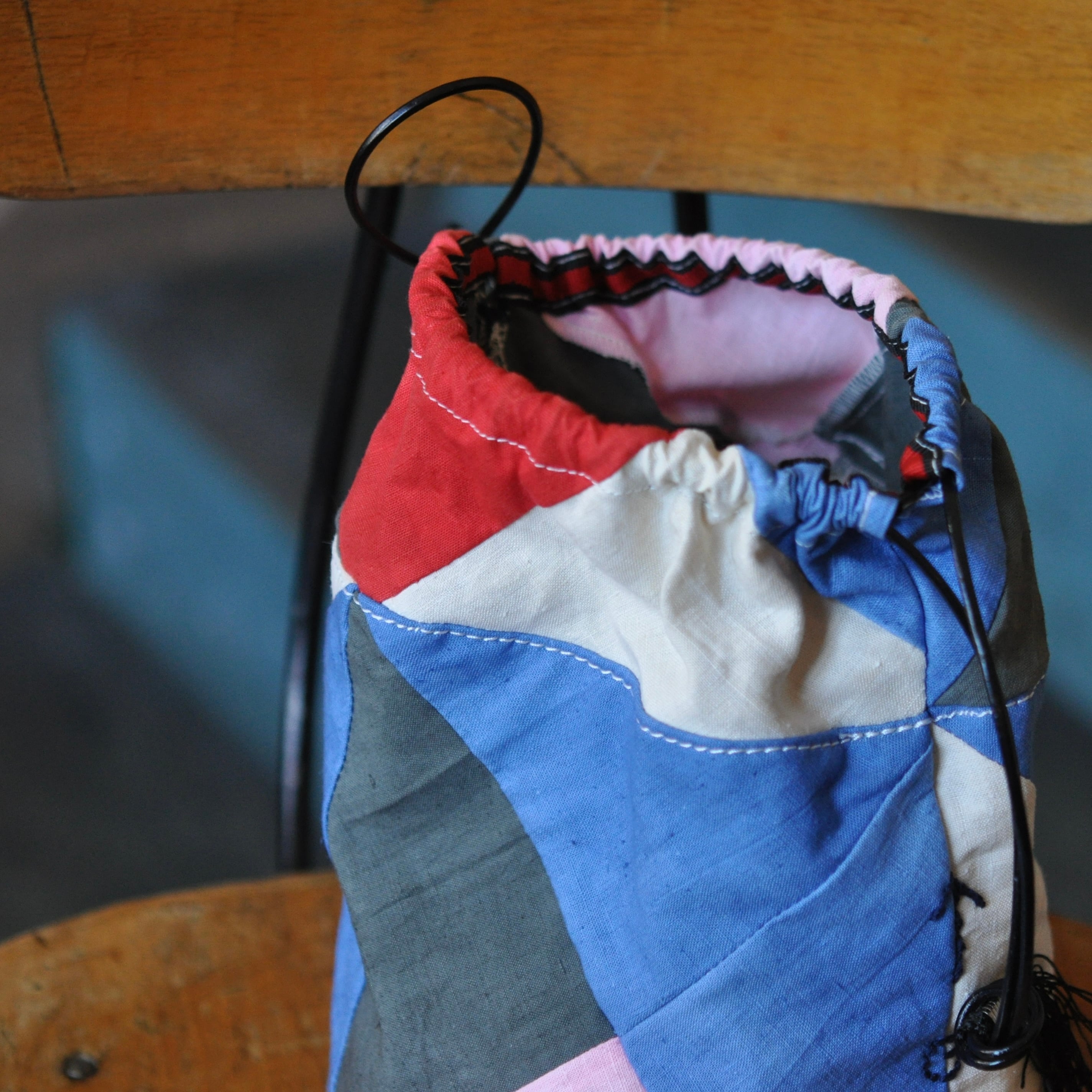さらにそれを染色、そしてパッチワークを施した巾着型バッグ。