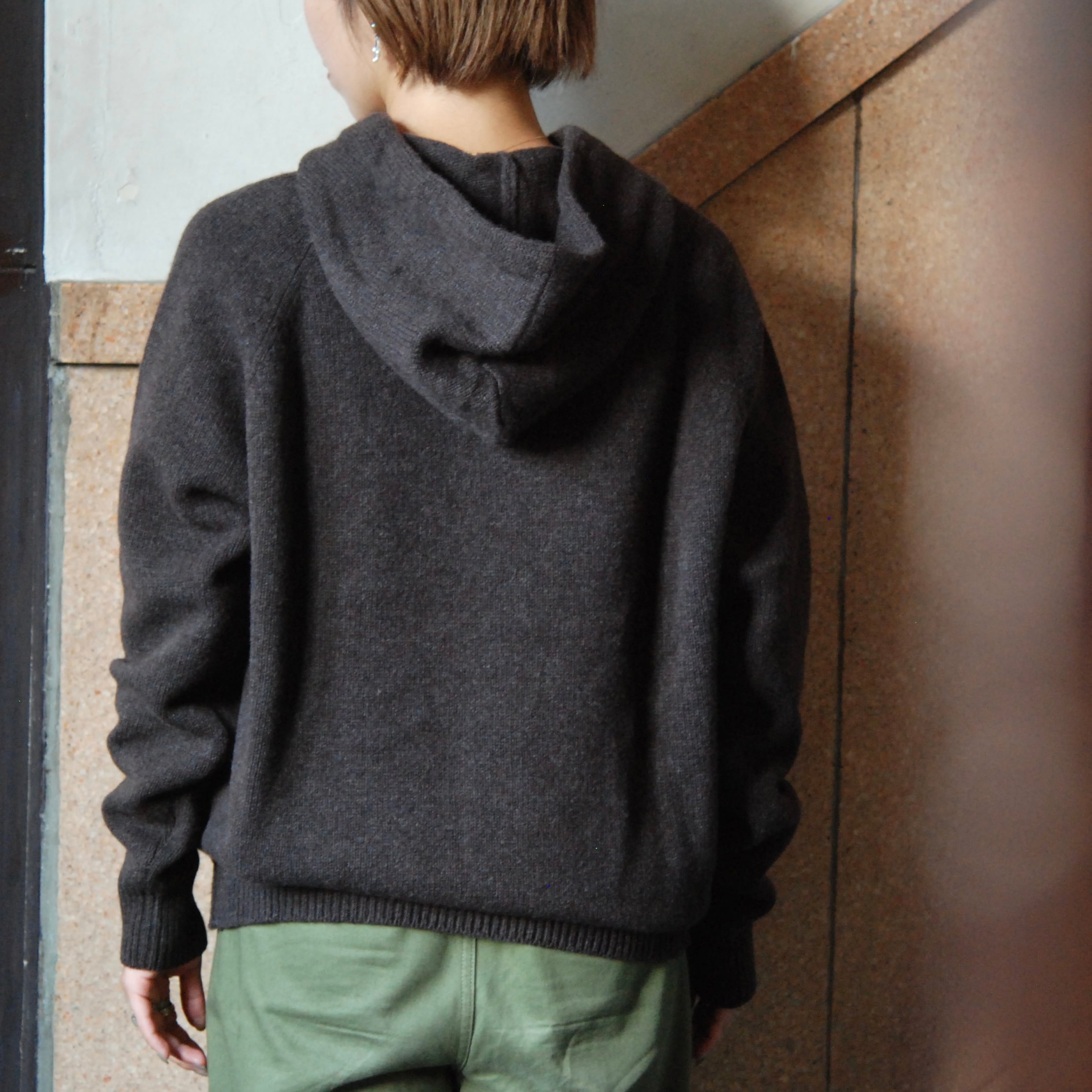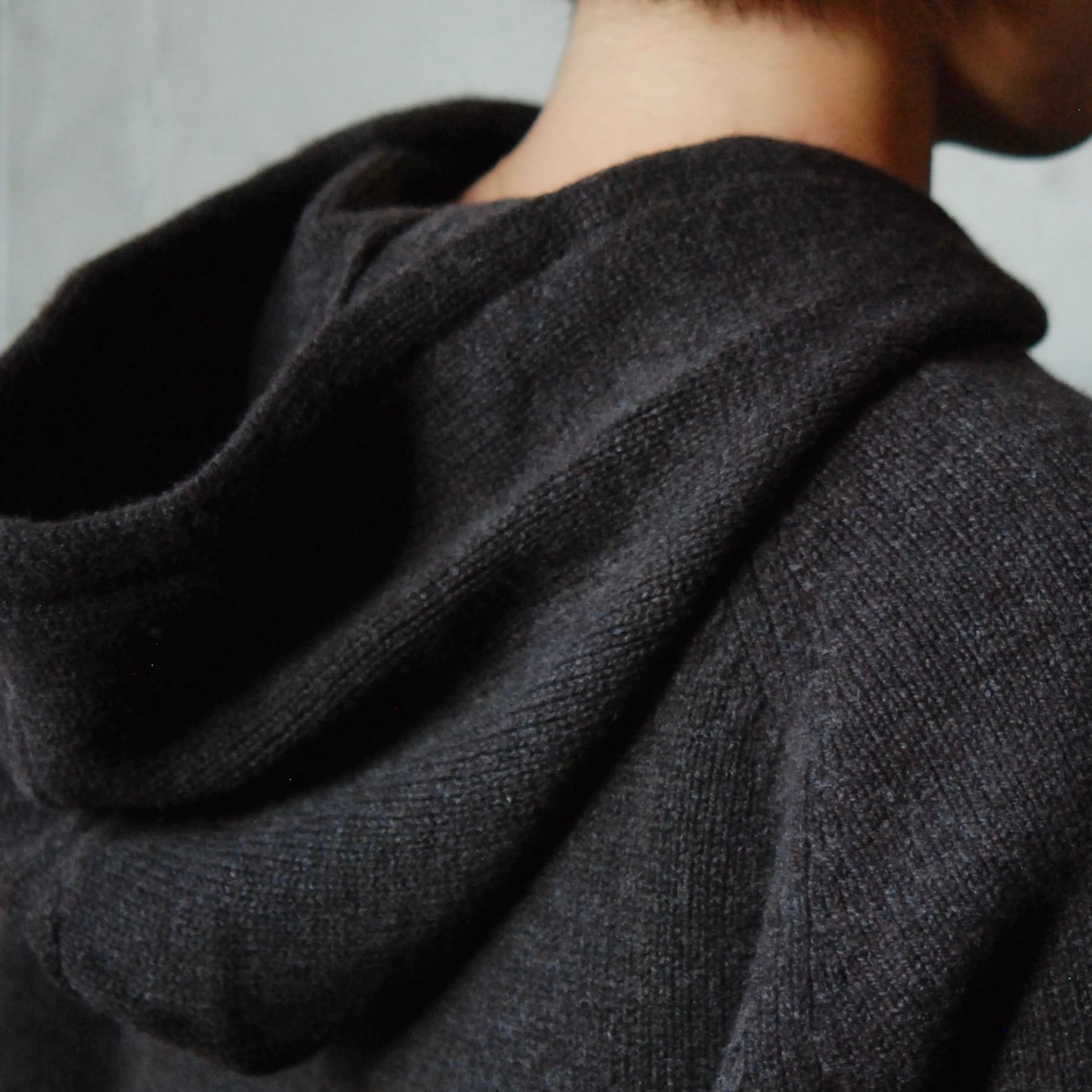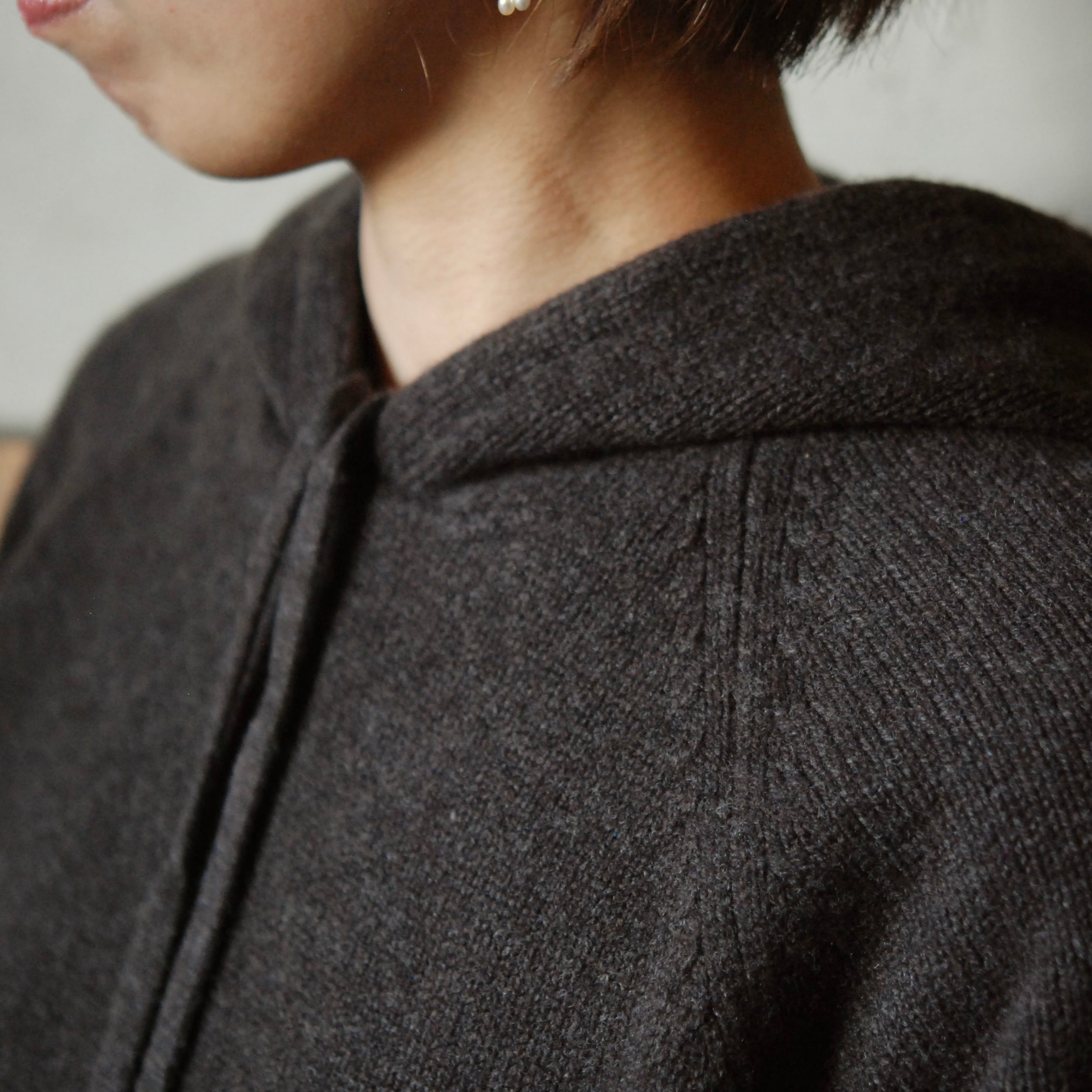 カジュアルなパーカースタイルもニット生地になると上品な印象に。