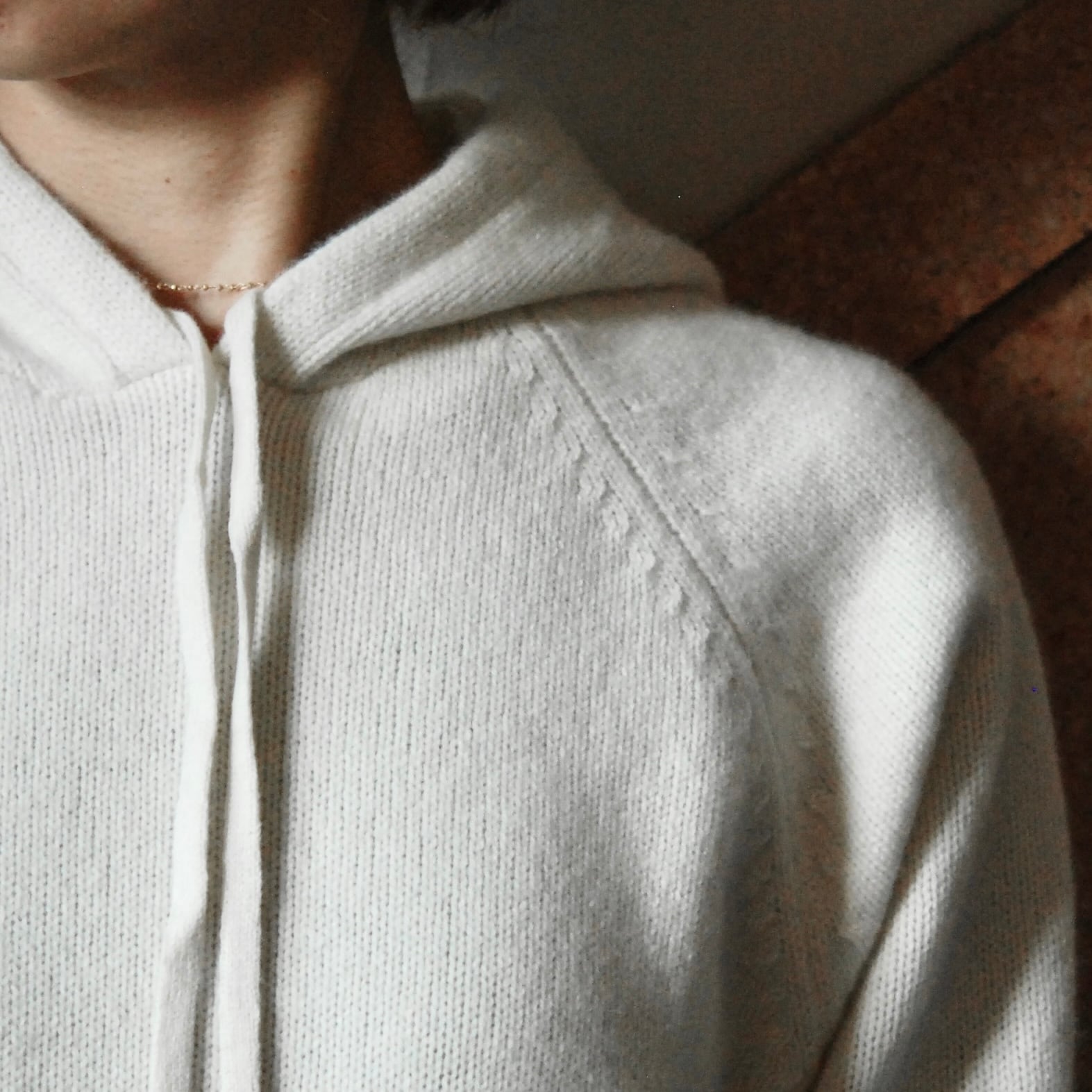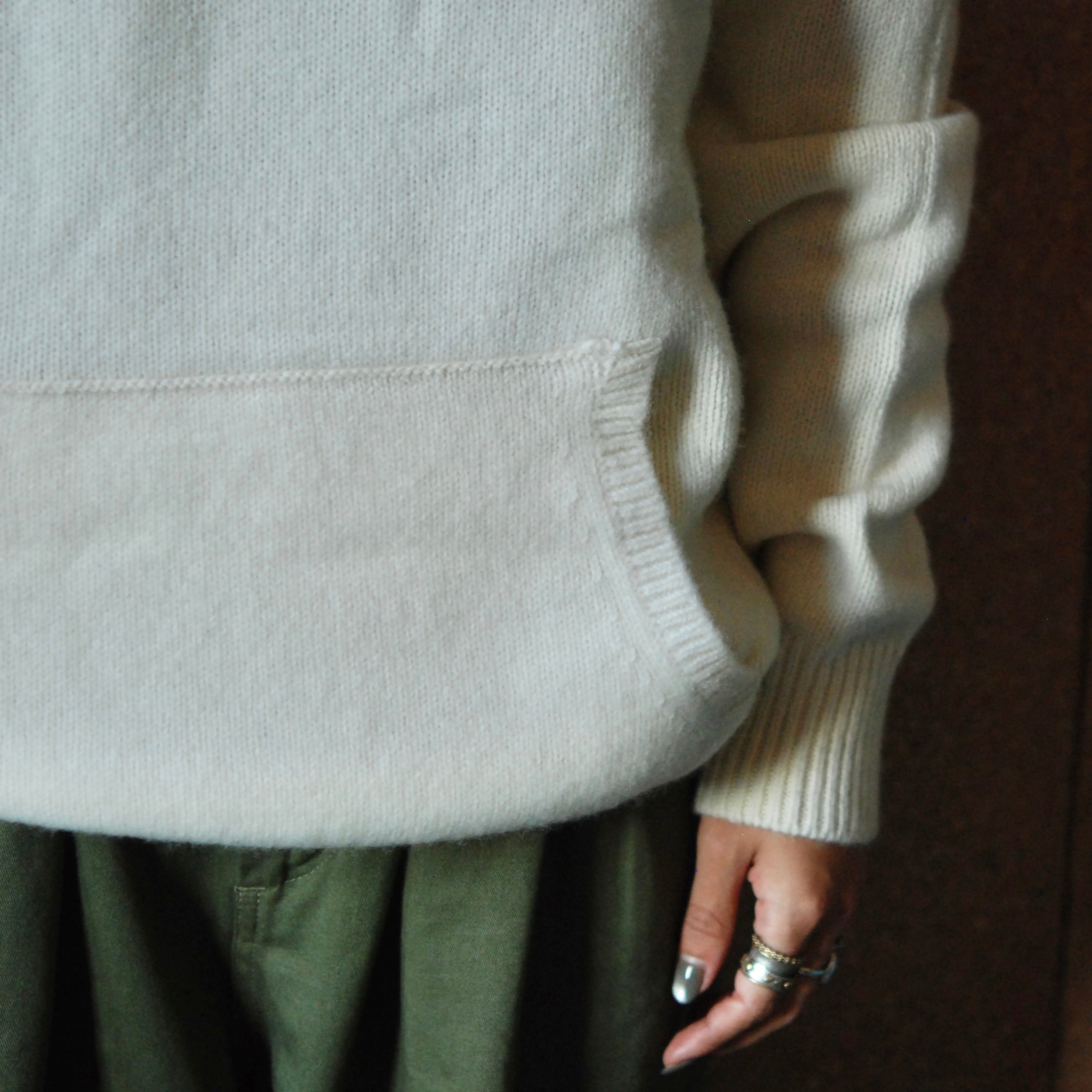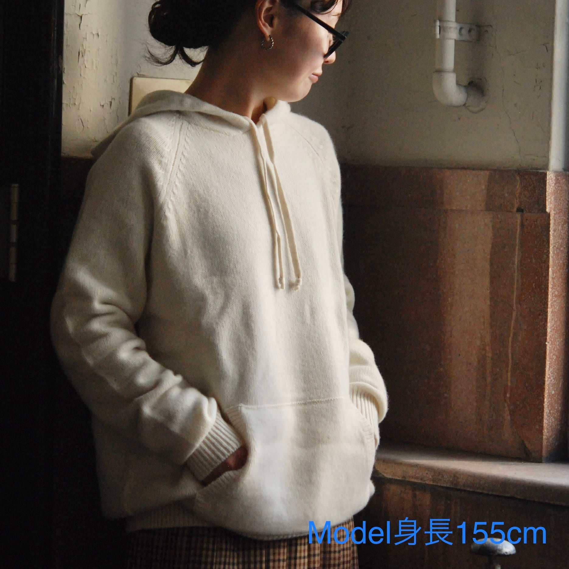 カジュアルなパーカースタイルもニット生地になると上品な印象に。