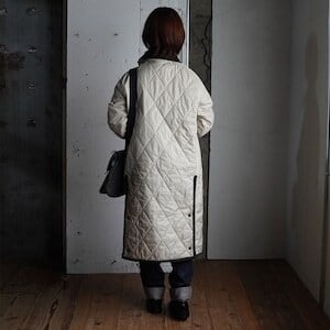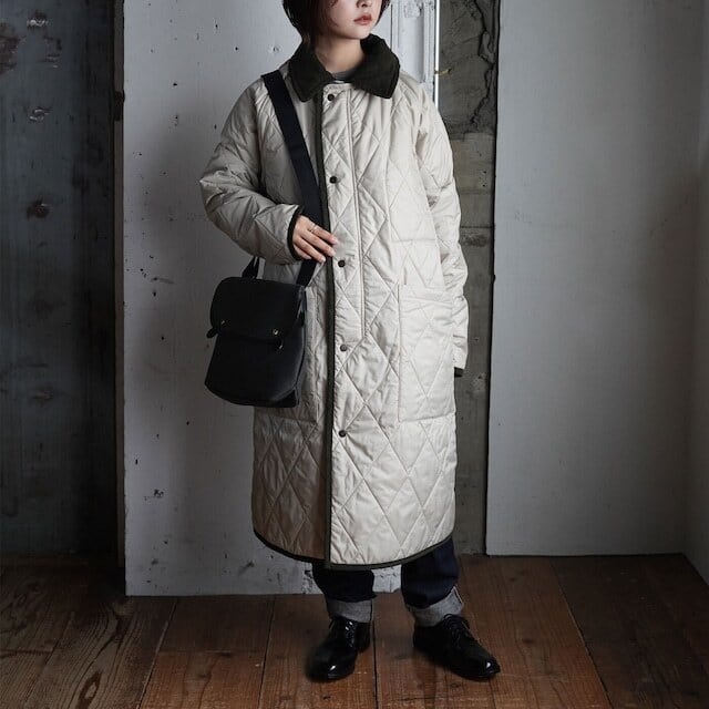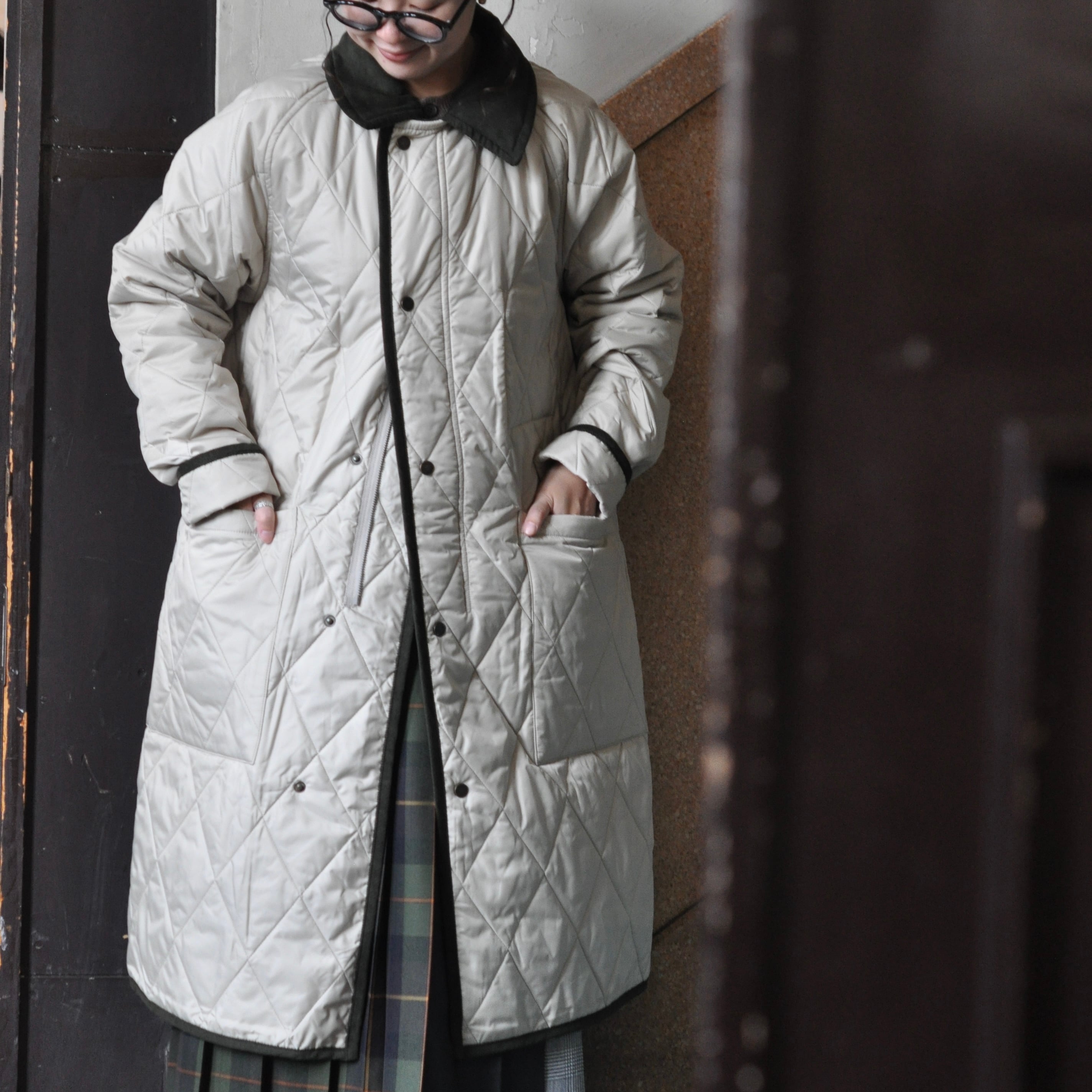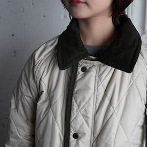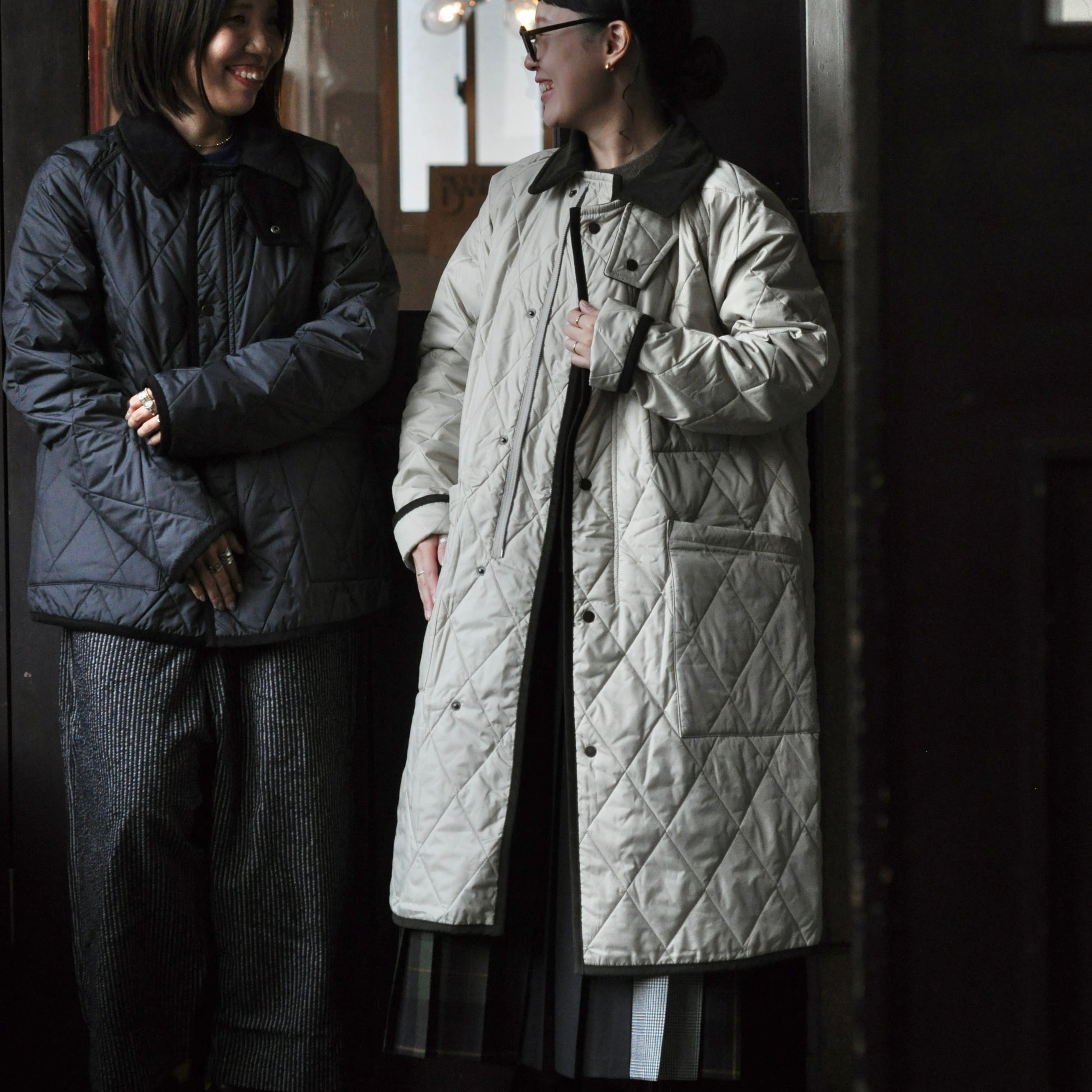 襟元や袖口、裾とコーデュロイがアクセントになった別注のキルティングコート。