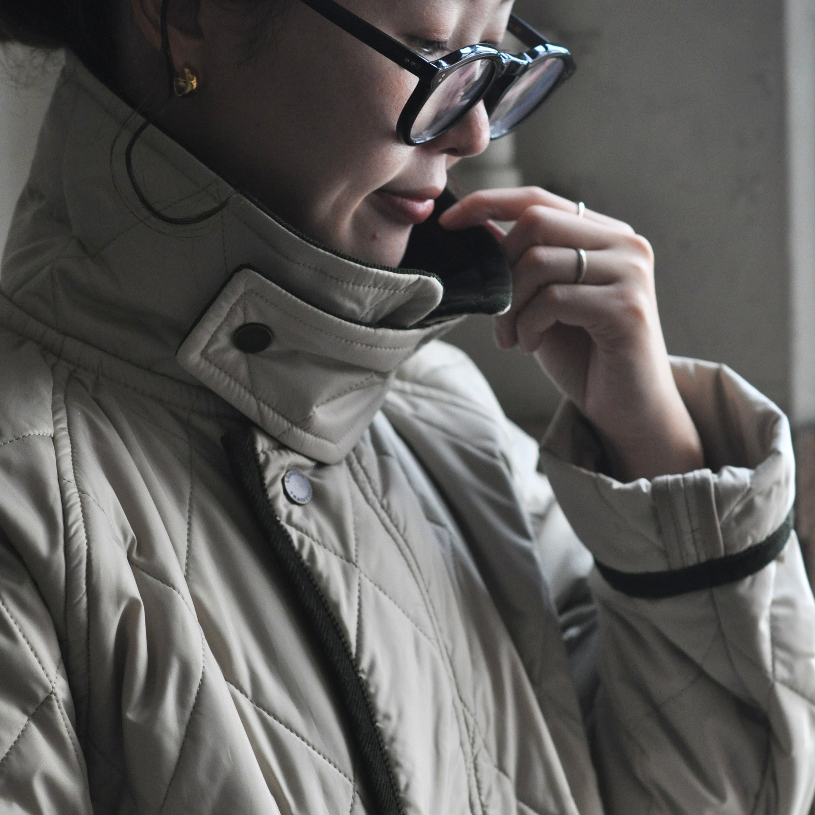 マフラーと合わせてももちろん相性のいいキルティングですが、気分で襟元を立ててビシッとした装いも素敵。