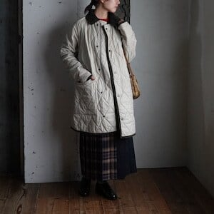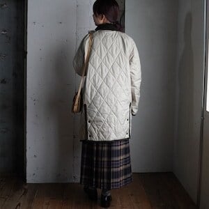 襟元や袖口、裾とコーデュロイがアクセントになったキルティングコート。
